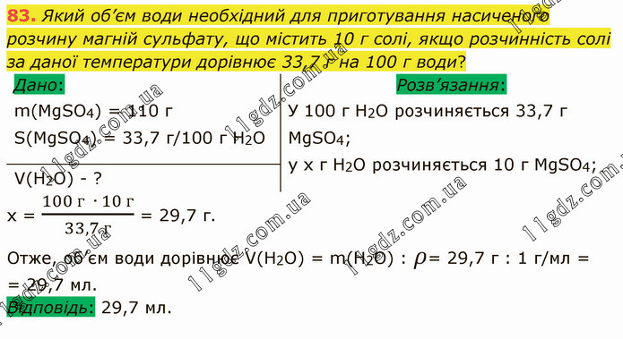 Який об’єм води необхідний для приготування насиченого розчину магній сульфату, що містить 10 г солі, якщо розчинність солі за даної температури дорівнює 33,7 г на 100 г води? Розв’язання: У 100 г Н2О розчиняється 33,7 г MgSО4; у х г Н2О розчиняється 10 г MgSО4; х = (100 г ∙ 10 г)/(33,7 г) = 29,7 г. Отже, об’єм води дорівнює V(H2О) = m(H2О) : ρ= 29,7 г : 1 г/мл = = 29,7 мл. Відповідь: 29,7 мл.