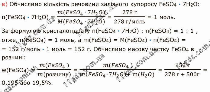 в) Обчислимо кількість речовини залізного купоросу FеSО4 ∙ 7Н2О: n(FеSО4 ∙ 7Н2О) = (m(FeSO_4 ∙ 7H_2 O))/(M(FeSO_4 ∙ 7H_2 O)) = (278 г)/(278 г/моль) = 1 моль. За формулою кристалогідрату n(FеSО4 ∙ 7Н2О) : n(FеSО4) = 1 : 1 , отже, n(FеSО4) = 1 моль, а m(FеSО4) = M(FеSО4) ∙ n(FеSО4) = = 152 г/моль ∙ 1 моль = 152 г. Обчислимо масову частку FеSО4 в розчині: w(FеSО4) = (m(FeSO_4 ))/(m(розчину)) = (m(FeSO_4 ))/(m(FeSO_4 ∙7H_2 O)+ m(H_2 O) ) = (152 г)/(278 г + 500г ) = 0,195 або 19,5%.