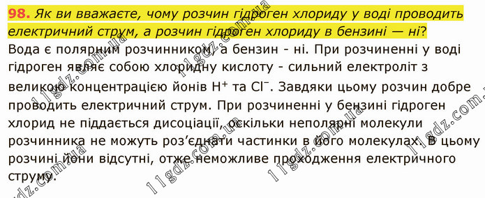 Як ви вважаєте, чому розчин гідроген хлориду у воді проводить електричний струм, а розчин гідроген хлориду в бензині — ні? Вода є полярним розчинником, а бензин - ні. При розчиненні у воді гідроген являє собою хлоридну кислоту - сильний електроліт з великою концентрацією йонів Н+ та Сl–. Завдяки цьому розчин добре проводить електричний струм. При розчиненні у бензині гідроген хлорид не піддається дисоціації, оскільки неполярні молекули розчинника не можуть роз’єднати частинки в його молекулах. В цьому розчині йони відсутні, отже неможливе проходження електричного струму.