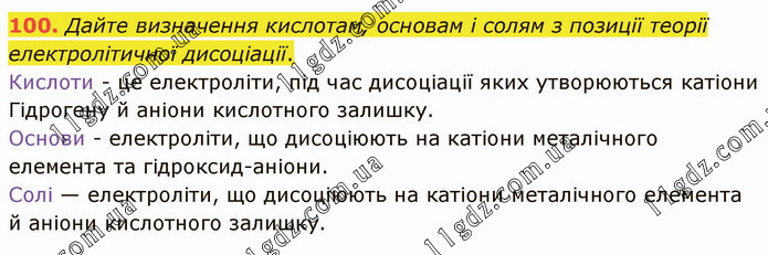 Дайте визначення кислотам, основам і солям з позиції теорії електролітичної дисоціації. Кислоти - це електроліти, під час дисоціації яких утворюються катіони Гідрогену й аніони кислотного залишку. Основи - електроліти, що дисоціюють на катіони металічного елемента та гідроксид-аніони. Солі — електроліти, що дисоціюють на катіони металічного елемента й аніони кислотного залишку.