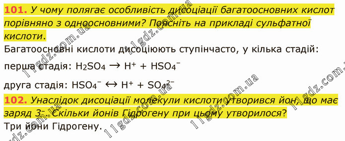 У чому полягає особливість дисоціації багатоосновних кислот порівняно з одноосновними? Поясніть на прикладі сульфатної кислоти. Багатоосновні кислоти дисоціюють ступінчасто, у кілька стадій: перша стадія: Н2SО4 → Н+ + НSО4– друга стадія: НSО4– ↔ Н+ + SO42– 102. Унаслідок дисоціації молекули кислоти утворився йон, що має заряд 3–. Скільки йонів Гідрогену при цьому утворилося? Три йони Гідрогену.