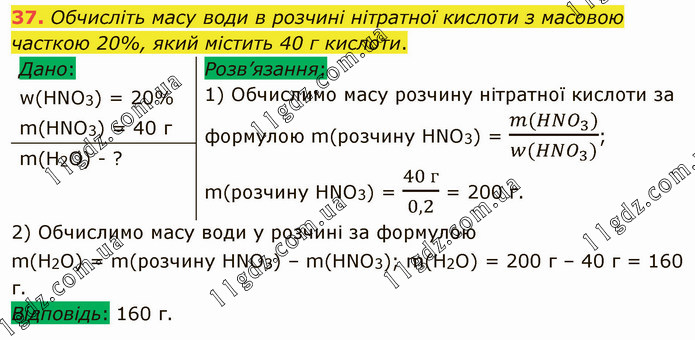 Обчисліть масу води в розчині нітратної кислоти з масовою часткою 20%, який містить 40 г кислоти. Розв’язання: 1) Обчислимо масу розчину нітратної кислоти за формулою m(розчину HNО3) = (m(HNO_3))/(w(HNO_3)); m(розчину HNО3) = (40 г)/0,2 = 200 г 2) Обчислимо масу води у розчині за формулою m(Н2О) = m(розчину НNО3) – m(НNО3); m(Н2О) = 200 г – 40 г = 160 г. Відповідь: 160 г.