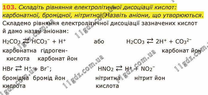 Складіть рівняння електролітичної дисоціації кислот: карбонатної, бромідної, нітритної. Назвіть аніони, що утворюються. Складемо рівняння електролітичної дисоціації зазначених кислот й дамо назви аніонам: Н2СО3 ⇄ НСО3– + Н+ або Н2СО3 ⇄ 2Н+ + СО32– карбонатна гідроген- карбонат йон кислота карбонат йон НВr ⇄ Н+ + Вr–; HNO2 ⇄ Н+ + NО2– бромідна бромід йон нітритна нітрит йон кислота кислота