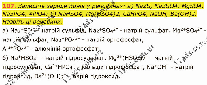 Запишіть заряди йонів у речовинах: a) Na2S, Na2SO4, MgSO4, Na3PO4, AlPO4; б) NaHSO4, Mg(HSO4)2, CaHPO4, NaOH, Ba(OH)2. Назвіть ці речовини. а) Nа2+S–2 — натрій сульфід, Nа2+SО42– - натрій сульфат, Мg2+SО42– - магній сульфат, Nа3+РО43+ - натрій ортофосфат, Аl3+РО42– - алюміній ортофосфат; б) Nа+НSО4– - натрій гідросульфат, Мg2+(НSО4)2– - магній гідросульфат, Са2+НРО4– - кальцій гідрофосфат, Nа+ОН– - натрій гідроксид, Ва2+(ОН)2– - барій гідроксид.