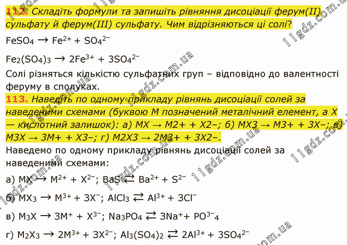 Складіть формули та запишіть рівняння дисоціації ферум(II) сульфату й ферум(III) сульфату. Чим відрізняються ці солі? FеSО4 → Fе2+ + SО42– Fе2(SО4)3 → 2Fе3+ + 3SО42– Солі різняться кількістю сульфатних груп – відповідно до валентності феруму в сполуках. 113. Наведіть по одному прикладу рівнянь дисоціації солей за наведеними схемами (буквою М позначений металічний елемент, а Х — кислотний залишок): а) МХ → М2+ + Х2–; б) МХ3 → М3+ + 3Х–; в) М3Х → 3М+ + Х3–; г) М2Х3 → 2М3+ + 3Х2–. Наведемо по одному прикладу рівнянь дисоціації солей за наведеними схемами: а) МХ → М2+ + X2–; ВаS ⇄ Ва2+ + S2– б) МХ3 → М3+ + ЗХ–; АlСl3 ⇄ Аl3+ + ЗСl– в) М3Х → ЗМ+ + X3–; Nа3РО4 ⇄ ЗNa++ РО3–4 г) М2Х3 → 2М3+ + ЗХ2–; Аl3(SО4)2 ⇄ 2Аl3+ + 3SО42–
