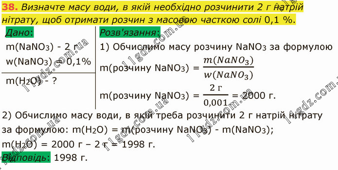 Визначте масу води, в якій необхідно розчинити 2 г натрій нітрату, щоб отримати розчин з масовою часткою солі 0,1 %. 1) Обчислимо масу розчину NaNО3 за формулою m(розчину NaNО3) = (m(NaNO_3))/(w(NaNO_3)) m(розчину NaNО3) = (2 г)/0,001 = 2000 г. 2) Обчислимо масу води, в якій треба розчинити 2 г натрій нітрату за формулою: m(Н2О) = m(розчину NaNO3) - m(NaNO3); m(Н2О) = 2000 г – 2 г = 1998 г. Відповідь: 1998 г.