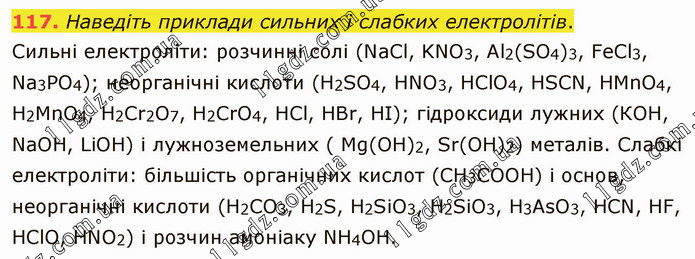 Наведіть приклади сильних і слабких електролітів. Сильні електроліти: розчинні солі (NаСl, KNО3, Аl2(SО4)3, FеСl3, Nа3РО4); неорганічні кислоти (Н2SО4, НNО3, НСlO4, НSCN, НМnО4, Н2МnО4, Н2Сr2О7, H2СrО4, НСl, НВr, НІ); гідроксиди лужних (КОН, NаОН, LiОН) і лужноземельних ( Mg(ОН)2, Sr(ОН)2) металів. Слабкі електроліти: більшість органічних кислот (СН3СООН) і основ, неорганічні кислоти (Н2СО3, Н2S, Н2SіО3, Н2SiО3, H3AsO3, НСN, НF, НСlО, НNО2) і розчин амоніаку NН4ОН.