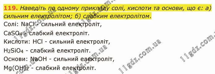 Наведіть по одному прикладу солі, кислоти та основи, що є: а) сильним електролітом; б) слабким електролітом. Солі: NaCl - сильний електроліт, CaSО4 - слабкий електроліт. Кислоти: НСl - сильний електроліт, H2SiО4 - слабкий електроліт. Основи: NaOH - сильний електроліт, Mg(ОH)2 - слабкий електроліт.