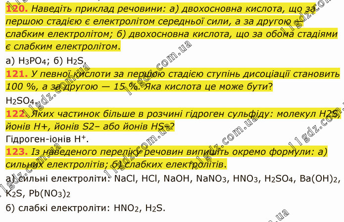 Наведіть приклад речовини: а) двохосновна кислота, що за першою стадією є електролітом середньої сили, а за другою — слабким електролітом; б) двохосновна кислота, що за обома стадіями є слабким електролітом. a) H3PО4; б) H2S. 121. У певної кислоти за першою стадією ступінь дисоціації становить 100 %, а за другою — 15 %. Яка кислота це може бути? H2SO4. 122. Яких частинок більше в розчині гідроген сульфіду: молекул H2S, йонів H+, йонів S2– або йонів HS–? Гідроген-іонів Н+. 123. Із наведеного переліку речовин випишіть окремо формули: а) сильних електролітів; б) слабких електролітів. а) сильні електроліти: NaCl, HCl, NaOH, NaNO3, HNО3, H2SО4, Ba(OH)2, K2S, Pb(NО3)2 б) слабкі електроліти: HNО2, H2S.