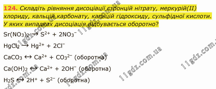 Складіть рівняння дисоціації стронцій нітрату, меркурій(ІІ) хлориду, кальцій карбонату, кальцій гідроксиду, сульфідної кислоти. У яких випадках дисоціація відбувається оборотно? Sr(NО3)2 → S2+ + 2NО3– HgCl2 → Hg2+ + 2Cl– CaCО3 ↔ Ca2+ + CО32– (оборотна) Ca(OH)2 ↔ Ca2+ + 2ОН– (оборотна) H2S ↔ 2H+ + S2– (оборотна)