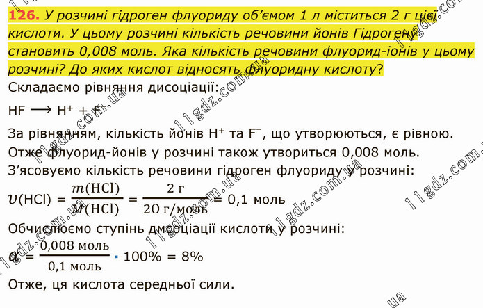 У розчині гідроген флуориду об’ємом 1 л міститься 2 г цієї кислоти. У цьому розчині кількість речовини йонів Гідрогену становить 0,008 моль. Яка кількість речовини флуорид-іонів у цьому розчині? До яких кислот відносять флуоридну кислоту? Складаємо рівняння дисоціації: HF ⟶ Н+ + F– За рівнянням, кількість йонів Н+ та F–, що утворюються, є рівною. Отже флуорид-йонів у розчині також утвориться 0,008 моль. З’ясовуємо кількість речовини гідроген флуориду у розчині: υ(HCl) = (m(HCl) )/(M(HCl) ) = (2 г)/(2О г/моль) = 0,1 моль Обчислюємо ступінь дмсоціації кислоти у розчині: α = (0,008 моль)/(0,1 моль) ∙ 100% = 8% Отже, ця кислота середньої сили.