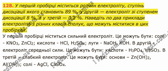 У першій пробірці міститься розчин електроліту, ступінь дисоціації якого становить 89 %, у другій — електроліт зі ступенем дисоціації 8 %, а у третій — 0,2 %. Наведіть по два приклади електролітів з різних класів сполук, що можуть міститися в цих пробірках. У першій пробірці міститься сильний електроліт. Це можуть бути: солі - KNО3, ZnCl2; кислоти - HCl, Н2SО4; луги - NаОН, КОН. В другій - електроліт середньої сили. Це можуть бути: кислоти - Н3РО4, Н2SО3. В третій – слабкий електроліт. Це можуть бути: основи – Zn(OH)2, Аl(ОН)3; солі - АgСl, СаSО4.