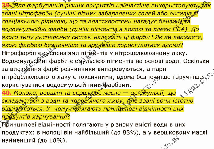 Для фарбування різних покриттів найчастіше використовують так звані нітрофарби (суміші різних забарвлених солей або оксидів зі спеціальною рідиною, що за властивостями нагадує бензин) та водоемульсійні фарби (суміш пігментів з водою та клеєм ПВА). До якого типу дисперсних систем належать ці фарби? Як ви вважаєте, якою фарбою безпечніше та зручніше користуватися вдома? Нітрофарби є суспензіями пігментів у нітроцелюлозному лаку. Водоемульсійні фарби є емульсією пігментів на основі води. Оскільки за висихання фарб розчинники випаровуються, а пари нітроцелюлозного лаку є токсичними, вдома безпечніше і зручніше користуватися водоемульсійними фарбами. 40. Молоко, вершки та вершкове масло — це емульсії, що складаються з води та коров’ячого жиру. Але зовні вони істотно відрізняються. У чому полягають принципові відмінності цих продуктів харчування? Принципові відмінності полягають у різному вмісті води в цих продуктах: в молоці він найбільший (до 88%), а у вершковому маслі найменший (до 18%).
