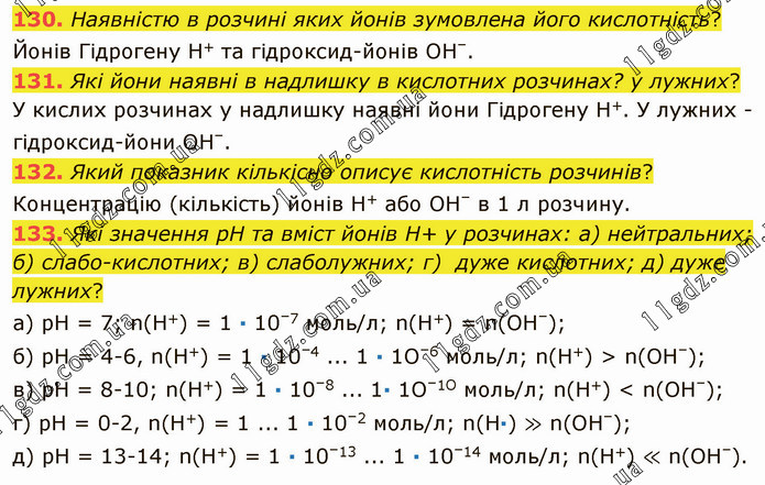 Наявністю в розчині яких йонів зумовлена його кислотність? Йонів Гідрогену Н+ та гідроксид-йонів ОН–. 131. Які йони наявні в надлишку в кислотних розчинах? у лужних? У кислих розчинах у надлишку наявні йони Гідрогену Н+. У лужних - гідроксид-йони ОН–. 132. Який показник кількісно описує кислотність розчинів? Концентрацію (кількість) йонів Н+ або ОН– в 1 л розчину. 133. Які значення рH та вміст йонів H+ у розчинах: а) нейтральних; б) слабо-кислотних; в) слаболужних; г) дуже кислотних; д) дуже лужних? а) рН = 7; n(Н+) = 1 ∙ 10–7 моль/л; n(Н+) = n(ОН–); б) рН = 4-6, n(Н+) = 1 ∙ 10–4 ... 1 ∙ 1О–6 моль/л; n(Н+) > n(ОН–); в) рН = 8-10; n(Н+) = 1 ∙ 10–8 ... 1∙ 1О–1О моль/л; n(Н+) < n(ОН–); г) рН = 0-2, n(Н+) = 1 ... 1 ∙ 10–2 моль/л; n(Н∙) ≫ n(ОН–); д) рН = 13-14; n(Н+) = 1 ∙ 10–13 ... 1 ∙ 10–14 моль/л; n(Н+) ≪ n(ОН–).
