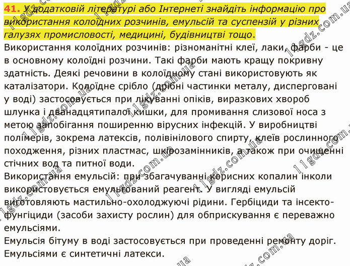 У додатковій літературі або Інтернеті знайдіть інформацію про використання колоїдних розчинів, емульсій та суспензій у різних галузях промисловості, медицині, будівництві тощо. Використання колоїдних розчинів: різноманітні клеї, лаки, фарби - це в основному колоїдні розчини. Такі фарби мають кращу покривну здатність. Деякі речовини в колоїдному стані використовують як каталізатори. Колоїдне срібло (дрібні частинки металу, дисперговані у воді) застосовується при лікуванні опіків, виразкових хвороб шлунка і дванадцятипалої кишки, для промивання слизової носа з метою запобігання поширенню вірусних інфекцій. У виробництві полімерів, зокрема латексів, полівінілового спирту, клеїв рослинного походження, різних пластмас, шкірозамінників, а також при очищенні стічних вод та питної води. Використання емульсій: при збагачуванні корисних копалин інколи використовується емульгований реагент. У вигляді емульсій виготовляють мастильно-охолоджуючі рідини. Гербіциди та інсекто- фунгіциди (засоби захисту рослин) для обприскування є переважно емульсіями. Емульсія бітуму в воді застосовується при проведенні ремонту доріг. Емульсіями є синтетичні латекси.