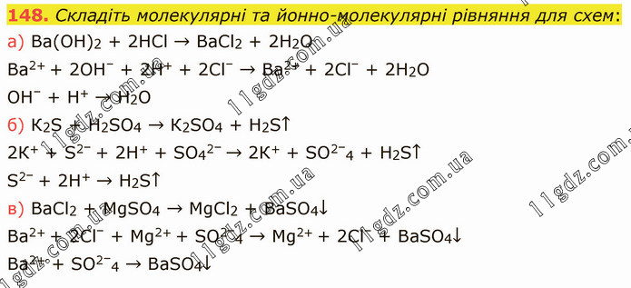 148. Cкладіть молекулярні та йонно-молекулярні рівняння для схем: а) Ва(ОН)2 + 2НСl → ВаСl2 + 2Н2О Ва2+ + 2ОН– + 2Н+ + 2Сl– → Ва2+ + 2Сl– + 2Н2О ОН– + Н+ → Н2О б) К2S + Н2SО4 → К2SО4 + Н2S↑ 2К+ + S2– + 2Н+ + SО42– → 2К+ + SО2–4 + Н2S↑ S2– + 2Н+ → Н2S↑ в) ВаСl2 + МgSО4 → МgСl2 + ВаSО4↓ Ва2+ + 2Сl– + Мg2+ + SО2–4 → Mg2+ + 2Сl– + ВаSО4↓ Ва2+ + SО2–4 → ВаSО4↓