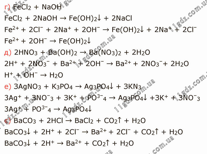 г) FеСl2 + NаОН FеСl2 + 2NaОH → Fе(ОН)2↓ + 2NаСl Fe2+ + 2Сl– + 2Nа+ + 2ОН– → Fе(ОН)2↓ + 2Nа+ + 2Сl– Fе2+ + 2ОН– → Fе(ОН)2↓ д) 2НNO3 + Ва(ОН)2 → Ва(NO3)2 + 2Н2О 2Н+ + 2NO3– + Ва2+ + 2ОН– → Ва2+ + 2NO3–+ 2Н2О Н+ + ОН– → Н2О е) ЗАgNО3 + К3РО4 → Аg3РО4↓ + ЗКN3 3Аg+ + ЗNO–3 + ЗК+ + РО3–4 → Аg3РО4↓ +ЗК+ + ЗNO–3 3Аg+ + РО3–4 → Аg3РО4↓ є) ВаСО3 + 2НСl → ВаСl2 + СО2↑ + Н2О ВаСО3↓ + 2Н+ + 2Сl– → Ва2+ + 2Сl– + СО2↑ + Н2О ВаСО3↓ + 2Н+ → Ва2+ + СО2↑ + Н2О