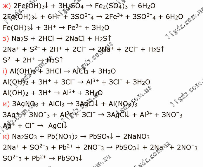 ж) 2Fе(ОН)3↓ + ЗН2SО4 → Fе2(SО4)3 + 6Н2О 2Fе(ОН)3↓ + 6Н+ + ЗSО2–4 → 2Fе3+ + ЗSО2–4 + 6Н2О Fе(ОН)3↓ + ЗН+ → Ре3+ + ЗН2О з) Na2S + 2НСl → 2NaCl + Н2S↑ 2Na+ + S2– + 2Н+ + 2Сl– → 2Na+ + 2Сl– + Н2S↑ S2– + 2Н+ → H2S↑ і) Аl(ОН)3 + ЗНСl → АlСl3 + ЗН2О Аl(ОН)2 + ЗН+ + ЗСl– → Аl3+ + ЗСl– + ЗН2О Аl(ОН)2 + ЗН+ → Аl3+ + ЗН2О и) ЗАgNO3 + АlСl3 → ЗАgСl↓ + Аl(NO3)3 ЗАg+ + ЗNO–3 + Аl3+ + ЗСl– → ЗAgCl↓ + Аl3+ + ЗNO–3 Ag+ + Сl– → АgСl↓ к) Na2SО3 + Рb(NO3)2 → РbSОз↓ + 2NaNО3 2Na+ + SО2–3 + Рb2+ + 2NO–3 → РbSО3↓ + 2Na+ + 2NO–3 SО2–3 + Рb2+ → РbSО3↓