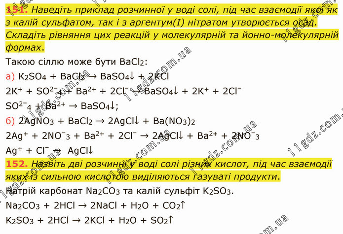 Наведіть приклад розчинної у воді солі, під час взаємодії якої як з калій сульфатом, так і з аргентум(I) нітратом утворюється осад. Складіть рівняння цих реакцій у молекулярній та йонно-молекулярній формах. Такою сіллю може бути ВаСl2: а) К2SО4 + ВаСl2 → ВаSО4↓ + 2КСl 2К+ + SО2–4 + Ва2+ + 2Сl– → ВаSО4↓ + 2К+ + 2Сl– SО2–4 + Ва2+ → ВаSО4↓; б) 2АgNO3 + ВаСl2 → 2AgCl↓ + Ва(NO3)2 2Аg+ + 2NO–3 + Ва2+ + 2Сl– → 2АgCl↓ + Ва2+ + 2NO–3 Ag+ + Сl– → АgСl↓ 152. Назвіть дві розчинні у воді солі різних кислот, під час взаємодії яких із сильною кислотою виділяються газуваті продукти. Натрій карбонат Na2CО3 та калій сульфіт K2SО3. Na2CO3 + 2HCl → 2NaCl + H2О + CО2↑ K2SО3 + 2HCl → 2KCl + H2О + SО2↑