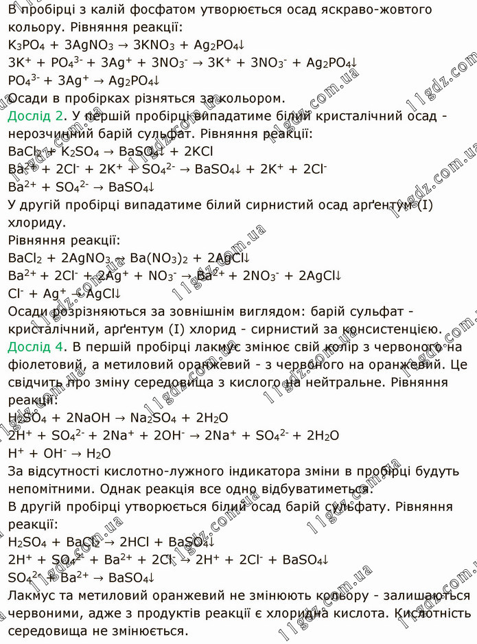 В пробірці з калій фосфатом утворюється осад яскраво-жовтого кольору. Рівняння реакції: K3PO4 + 3AgNO3 → 3KNO3 + Ag2PO4↓ 3K+ + PO43- + 3Ag+ + 3NO3- → 3K+ + 3NO3- + Ag2PO4↓ PO43- + 3Ag+ → Ag2PO4↓ Осади в пробірках різняться за кольором. Дослід 2. У першій пробірці випадатиме білий кристалічний осад - нерозчинний барій сульфат. Рівняння реакції: BaCl2 + K2SO4 → BaSO4↓ + 2KCl Ba2+ + 2Cl- + 2K+ + SO42- → BaSO4↓ + 2K+ + 2Cl- Ba2+ + SO42- → BaSO4↓ У другій пробірці випадатиме білий сирнистий осад арґентум (І) хлориду. Рівняння реакції: BaCl2 + 2AgNO3 → Ba(NO3)2 + 2AgCl↓ Ba2+ + 2Cl- + 2Ag+ + NO3- → Ba2+ + 2NO3- + 2AgCl↓ Cl- + Ag+ → AgCl↓ Осади розрізняються за зовнішнім виглядом: барій сульфат - кристалічний, арґентум (І) хлорид - сирнистий за консистенцією. Дослід 4. В першій пробірці лакмус змінює свій колір з червоного на фіолетовий, а метиловий оранжевий - з червоного на оранжевий. Це свідчить про зміну середовища з кислого на нейтральне. Рівняння реакції: H2SO4 + 2NaOH → Na2SO4 + 2H2O 2H+ + SO42- + 2Na+ + 2OH- → 2Na+ + SO42- + 2H2O H+ + OH- → H2O За відсутності кислотно-лужного індикатора зміни в пробірці будуть непомітними. Однак реакція все одно відбуватиметься. В другій пробірці утворюється білий осад барій сульфату. Рівняння реакції: H2SO4 + BaCl2 → 2HCl + BaSO4↓ 2H+ + SO42- + Ba2+ + 2Cl- → 2H+ + 2Cl- + BaSO4↓ SO42- + Ba2+ → BaSO4↓ Лакмус та метиловий оранжевий не змінюють кольору - залишаються червоними, адже з продуктів реакції є хлоридна кислота. Кислотність середовища не змінюється.