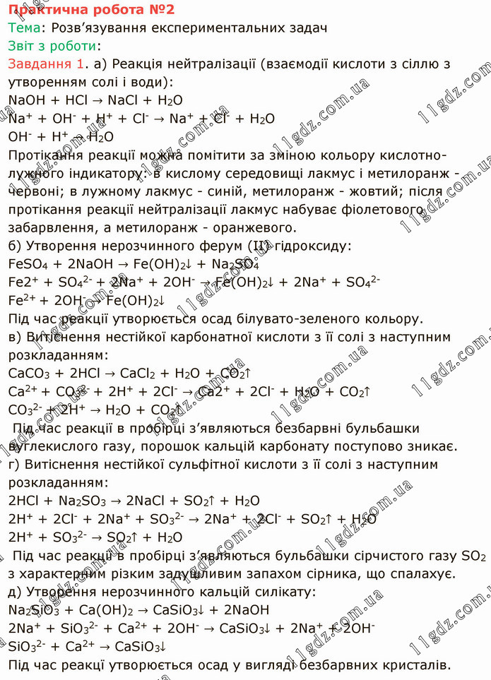 Тема: Розв’язування експериментальних задач Звіт з роботи: Завдання 1. а) Реакція нейтралізації (взаємодії кислоти з сіллю з утворенням солі і води): NaOH + HCl → NaCl + H2O Na+ + OH- + H+ + Cl- → Na+ + Cl- + H2O OH- + H+ → H2O Протікання реакції можна помітити за зміною кольору кислотно-лужного індикатору: в кислому середовищі лакмус і метилоранж - червоні; в лужному лакмус - синій, метилоранж - жовтий; після протікання реакції нейтралізації лакмус набуває фіолетового забарвлення, а метилоранж - оранжевого. б) Утворення нерозчинного ферум (ІІ) гідроксиду: FeSO4 + 2NaOH → Fe(OH)2↓ + Na2SO4 Fe2+ + SO42- + 2Na+ + 2OH- → Fe(OH)2↓ + 2Na+ + SO42- Fe2+ + 2OH- → Fe(OH)2↓ Під час реакції утворюється осад білувато-зеленого кольору. в) Витіснення нестійкої карбонатної кислоти з її солі з наступним розкладанням: CaCO3 + 2HCl → CaCl2 + H2O + CO2↑ Ca2+ + CO32- + 2H+ + 2Cl- → Ca2+ + 2Cl- + H2O + CO2↑ CO32- + 2H+ → H2O + CO2↑ Під час реакції в пробірці з’являються безбарвні бульбашки вуглекислого газу, порошок кальцій карбонату поступово зникає. г) Витіснення нестійкої сульфітної кислоти з її солі з наступним розкладанням: 2HCl + Na2SO3 → 2NaCl + SO2↑ + H2O 2H+ + 2Cl- + 2Na+ + SO32- → 2Na+ + 2Cl- + SO2↑ + H2O 2H+ + SO32- → SO2↑ + H2O Під час реакції в пробірці з’являються бульбашки сірчистого газу SO2 з характерним різким задушливим запахом сірника, що спалахує. д) Утворення нерозчинного кальцій силікату: Na2SiO3 + Ca(OH)2 → CaSiO3↓ + 2NaOH 2Na+ + SiO32- + Ca2+ + 2OH- → CaSiO3↓ + 2Na+ + 2OH- SiO32- + Ca2+ → CaSiO3↓ Під час реакцї утворюється осад у вигляді безбарвних кристалів.
