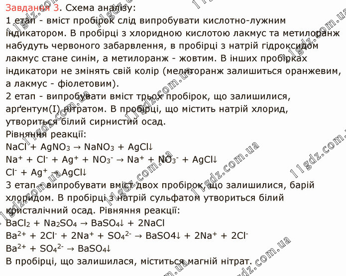 Завдання 3. Схема аналізу: 1 етап - вміст пробірок слід випробувати кислотно-лужним індикатором. В пробірці з хлоридною кислотою лакмус та метилоранж набудуть червоного забарвлення, в пробірці з натрій гідроксидом лакмус стане синім, а метилоранж - жовтим. В інших пробірках індикатори не змінять свій колір (мелиторанж залишиться оранжевим, а лакмус - фіолетовим). 2 етап - випробувати вміст трьох пробірок, що залишилися, арґентум(І) нітратом. В пробірці, що містить натрій хлорид, утвориться білий сирнистий осад. Рівняння реакції: NaCl + AgNO3 → NaNO3 + AgCl↓ Na+ + Cl- + Ag+ + NO3- → Na+ + NO3- + AgCl↓ Cl- + Ag+ → AgCl↓ 3 етап - випробувати вміст двох пробірок, що залишилися, барій хлоридом. В пробірці з натрій сульфатом утвориться білий кристалічний осад. Рівняння реакції: BaCl2 + Na2SO4 → BaSO4↓ + 2NaCl Ba2+ + 2Cl- + 2Na+ + SO42- → BaSO4↓ + 2Na+ + 2Cl- Ba2+ + SO42- → BaSO4↓ В пробірці, що залишилася, міститься магній нітрат.