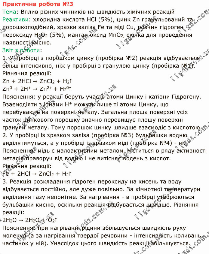 Тема: Вплив різних чинників на швидкість хімічних реакцій Реактиви: хлоридна кислота HCl (5%), цинк Zn гранульований та порошкоподібний, зразки заліза Fe та міді Cu, розчин гідроген пероксиду H2O2 (5%), манган оксид MnO2, скіпка для проведення наявності кисню. Звіт з роботи: 1. У пробірці з порошком цинку (пробірка №2) реакція відбувається більш інтенсивно, ніж у пробірці з гранулою цинку (пробірка №1). Рівняння реакції: Zn + 2HCl → ZnCl2 + H2↑ Zn0 + 2H+ → Zn2+ + H20↑ Пояснення: у реакції беруть участь атоми Цинку і катіони Гідрогену. Взаємодіяти з іонами Н+ можуть лише ті атоми Цинку, що перебувають на поверхні металу. Загальна площа поверхні усіх часток цинкового порошку значно перевищує плошу поверхні гранули металу. Тому порошок цинку швидше взаємодіє з кислотою. 2. У пробірці із зразком заліза (пробірка №3) бульбашки водню виділятимуться, а у пробірці із зразком міді (пробірка №4) - ні. Пояснення: мідь є малоактивним металом, міститься в ряду активності металів праворуч від водню і не витісняє водень з кислот. Рівняння реакції: Fe + 2HCl → ZnCl2 + H2↑ 3. Реакція розкладання гідроген пероксиду на кисень та воду відбувається постійно, але дуже повільно. За кімнотної температури виділення газу непомітне. За нагрівання - в пробірці утворюються бульбашки кисню, оскільки реакція відбувається швидше. Рівняння реакції: 2H2O → 2H2O + O2↑ Пояснення: при нагріванні рідини збільшується швидкість руху молекул (а за нагрівання твердої речовини - інтенсивність коливань частинок у ній). Унаслідок цього швидкість реакції збільшується.