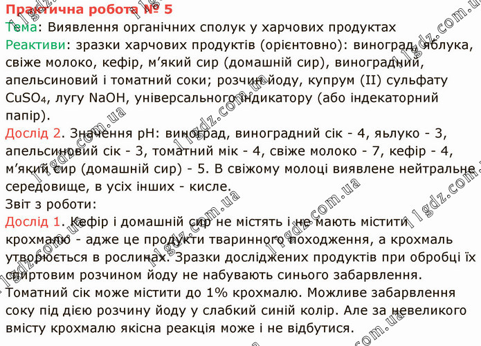 Тема: Виявлення органічних сполук у харчових продуктах Реактиви: зразки харчових продуктів (орієнтовно): виноград, яблука, свіже молоко, кефір, м’який сир (домашній сир), виноградний, апельсиновий і томатний соки; розчин йоду, купрум (ІІ) сульфату CuSO4, лугу NaOH, універсального індикатору (або індекаторний папір). Дослід 2. Значення рН: виноград, виноградний сік - 4, яьлуко - 3, апельсиновий сік - 3, томатний мік - 4, свіже молоко - 7, кефір - 4, м’який сир (домашній сир) - 5. В свіжому молоці виявлене нейтральне середовище, в усіх інших - кисле. Звіт з роботи: Дослід 1. Кефір і домашній сир не містять і не мають містити крохмалю - адже це продукти тваринного походження, а крохмаль утворюється в рослинах. Зразки досліджених продуктів при обробці їх спиртовим розчином йоду не набувають синього забарвлення. Томатний сік може містити до 1% крохмалю. Можливе забарвлення соку під дією розчину йоду у слабкий синій колір. Але за невеликого вмісту крохмалю якісна реакція може і не відбутися.