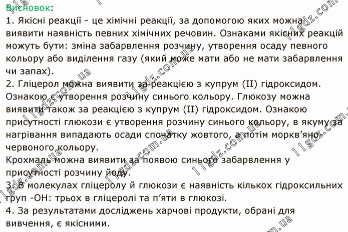 Висновок: 1. Якісні реакції - це хімічні реакції, за допомогою яких можна виявити наявність певних хімічних речовин. Ознаками якісних реакцій можуть бути: зміна забарвлення розчину, утворення осаду певного кольору або виділення газу (який може мати або не мати забарвлення чи запах). 2. Гліцерол можна виявити за реакцією з купрум (ІІ) гідроксидом. Ознакою є утворення розчину синього кольору. Глюкозу можна виявити також за реакцією з купрум (ІІ) гідроксидом. Ознакою присутності глюкози є утворення розчину синього кольору, в якуму за нагрівання випадають осади спочатку жовтого, а потім моркв’яно-червоного кольору. Крохмаль можна виявити за появою синього забарвлення у присутності розчину йоду. 3. В молекулах гліцеролу й глюкози є наявність кількох гідроксильних груп -ОН: трьох в гліцеролі та п’яти в глюкозі. 4. За результатами досліджень харчові продукти, обрані для вивчення, є якісними.