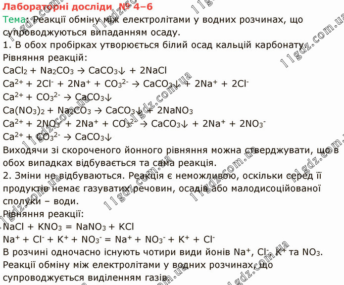 Тема: Реакції обміну між електролітами у водних розчинах, що супроводжуються випаданням осаду. 1. В обох пробірках утворюється білий осад кальцій карбонату. Рівняння реакцій: CaCl2 + Na2CO3 → CaCO3↓ + 2NaCl Ca2+ + 2Cl- + 2Na+ + CO32- → CaCO3↓ + 2Na+ + 2Cl- Ca2+ + CO32- → CaCO3↓ Ca(NO3)2 + Na2CO3 → CaCO3↓ + 2NaNO3 Ca2+ + 2NO3- + 2Na+ + CO32- → CaCO3↓ + 2Na+ + 2NO3- Ca2+ + CO32- → CaCO3↓ Виходячи зі скороченого йонного рівняння можна стверджувати, що в обох випадках відбувається та сама реакція. 2. Зміни не відбуваються. Реакція є неможливою, оскільки серед її продуктів немає газуватих речовин, осадів або малодисоційованої сполуки – води. Рівняння реакції: NaCl + KNO3 = NaNO3 + KCl Na+ + Cl- + K+ + NO3- = Na+ + NO3- + K+ + Cl- В розчині одночасно існують чотири види йонів Na+, Cl-, K+ та NO3. Реакції обміну між електролітами у водних розчинах, що супроводжується виділенням газів.