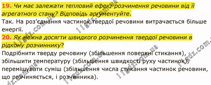 Чи має залежати тепловий ефект розчинення речовини від її агрегатного стану? Відповідь аргументуйте. Так. На роз’єднання частинок твердої речовини витрачається більше енергії. 20. Як можна досягти швидкого розчинення твердої речовини в рідкому розчиннику? Подрібнити тверду речовину (збільшення поверхні стикання), збільшити температуру (збільшення швидкості руху частинок), перемішувати суміш (збільшення числа стикання частинок речовини, що розчиняється, і розчинника).