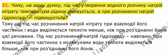 Чому, на вашу думку, під час утворення водного розчину натрій нітрату температура рідини знижується, а при розчиненні натрій гідроксиду — підвищується? Тому що під час розчинення натрій нітрату при взаємодії його частинок і води виділяється теплоти менше, ніж при роз’єднанні йонів цієї речовини. Під час розчинення натрій гідроксиду – навпаки. При взаємодії його частинок з молекулами води теплоти виділяється більше, ніж при роз’єднанні його йонів.
