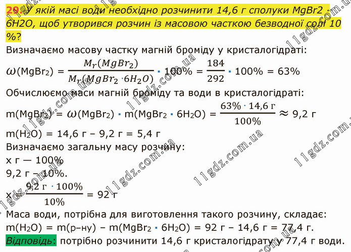У якій масі води необхідно розчинити 14,6 г сполуки MgBr2 · 6H2O, щоб утворився розчин із масовою часткою безводної солі 10 %? Визначаємо масову частку магній броміду у кристалогідраті: ω(MgBr2) = (M_r (Mg〖Br〗_2))/(M_r (Mg〖Br〗_2 ∙6H_2 O)) ∙ 100% = 184/292 ∙ 100% = 63% Обчислюємо маси магній броміду та води в кристалогідраті: m(MgBr2) = ω(MgBr2) ∙ m(MgBr2 ∙ 6H2O) = (63% ∙ 14,6 г)/(100%) ≈ 9,2 г m(Н2O) = 14,6 г – 9,2 г = 5,4 г Визначаємо загальну масу розчину: х г — 100% 9,2 г – 10%. х = (9,2 г ∙ 100%)/(10%) = 92 г Маса води, потрібна для виготовлення такого розчину, складає: m(Н2О) = m(р–ну) – m(МgВr2 ∙ 6Н2O) = 92 г – 14,6 г = 77,4 г. Відповідь: потрібно розчинити 14,6 г кристалогідрату у 77,4 г води.