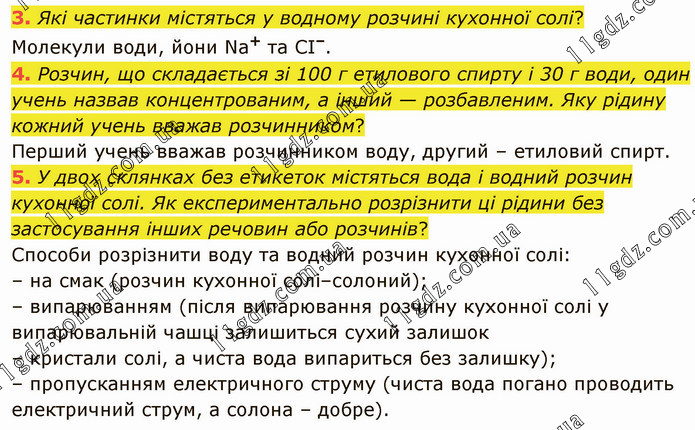 Які частинки містяться у водному розчині кухонної солі? Молекули води, йони Nа+ та СІ–. 4. Розчин, що складається зі 100 г етилового спирту і 30 г води, один учень назвав концентрованим, а інший — розбавленим. Яку рідину кожний учень вважав розчинником? Перший учень вважав розчинником воду, другий – етиловий спирт. 5. У двох склянках без етикеток містяться вода і водний розчин кухонної солі. Як експериментально розрізнити ці рідини без застосування інших речовин або розчинів? Способи розрізнити воду та водний розчин кухонної солі: – на смак (розчин кухонної солі–солоний); – випарюванням (після випарювання розчину кухонної солі у випарювальній чашці залишиться сухий залишок – кристали солі, а чиста вода випариться без залишку); – пропусканням електричного струму (чиста вода погано проводить електричний струм, а солона – добре).