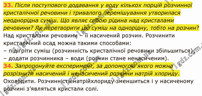 Після поступового додавання у воду кількох порцій розчинної кристалічної речовини і тривалого перемішування утворилася неоднорідна суміш. Що являє собою рідина над кристалами речовини? Як перетворити цю суміш на однорідну, тобто на розчин? Над кристалами речовини – її насичений розчин. Розчинити кристалічний осад можна такими способами: – підігріти суміш (розчинність кристалічної речовини збільшиться); – додати розчинника – води (розчин стане ненасиченим). 34. Запропонуйте експеримент, за допомогою якого можна розрізнити насичений і ненасичений розчини натрій хлориду. Охолодити. Розчинність натрійхлориду зменшиться і у насиченому розчині з’являться кристали солі.