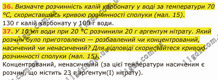 Визначте розчинність калій карбонату у воді за температури 70 °С, скориставшись кривою розчинності сполуки (мал. 15). 130 г калій карбонату у 100 г води. 37. У 10 мл води при 20 °С розчинили 20 г аргентум нітрату. Який розчин було приготовлено — розбавлений чи концентрований, насичений чи ненасичений? Для відповіді скористайтеся кривою розчинності сполуки (мал. 15). Концентрований, ненасичений (за цієї температури насиченим є розчин, що містить 23 г арґентум(І) нітрату).
