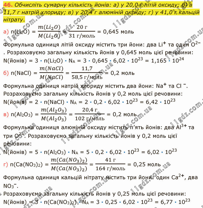 Обчисліть сумарну кількість йонів: а) у 20,0 г літій оксиду; б) в 11,7 г натрій хлориду; в) у 20,4 г алюміній оксиду; г) у 41,0 г кальцій нітрату. а) n(Li2O) = (m(〖Li〗_2 O))/(M(〖Li〗_2 O)) = (20 г)/(31 г/моль) = 0,645 моль Формульна одиниця літій оксиду містить три йони: два Li+ та один О2–. Розраховуємо загальну кількість йонів у 0,645 моль цієї речовини: N(йонів) = 3 ∙ n(Li2O) ∙ NA = 3 ∙ 0,645 ∙ 6,02 ∙ 1023 = 1,165 ∙ 1024 б) n(NaCl) = (m(NaCl))/(M(NaCl)) = 11,7/(58,5 г/моль) = 0,2 моль Формульна одиниця натрій хлориду містить два йони: Na+ та Сl –. Розраховуємо загальну кількість йонів у 0,2 моль цієї речовини: N(йонів) = 2 ∙ n(NaСl) ∙ NА = 2 ∙ 0,2 ∙ 6,02 ∙ 1023 = 6,42 ∙ 1023 в) n(Al2O3) = (m(〖Al〗_2 O_3))/(M(〖Al〗_2 O_3)) = (20,4 г)/(102 г/моль) = 0,2 моль Формульна одиниця алюміній оксиду містить п’ять йонів: два Al3+ та три О2–. Розраховуємо загальну кількість йонів у 0,2 моль цієї речовини: N(йонів) = 5 ∙ n(Аl2O3) ∙ NA = 5 ∙ 0,2 ∙ 6,02 ∙ 1023 = 6,02 ∙ 1023 г) n(Ca(NO3)2) = (m(Ca(NO_3 )_2))/(M(Ca(NO_3 )_2)) = (41 г)/(164 г/моль) = 0,25 моль Формульна одиниця кальцій нітрату містить три йони: один Са2+, два NO3–. Розраховуємо загальну кількість йонів у 0,25 моль цієї речовини: N(йонів) = 3 ∙ n(Ca(NO3)2) ∙ NA = 3 ∙ 0,25 ∙ 6,02 ∙ 1023 = 6,77 ∙ 1023