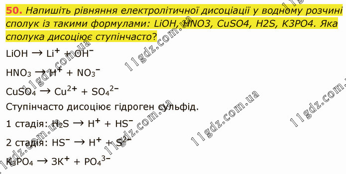 Напишіть рівняння електролітичної дисоціації у водному розчині сполук із такими формулами: LiOH, HNO3, CuSO4, H2S, K3PO4. Яка сполука дисоціює ступінчасто? LiОН → Li+ + OH– HNO3 → H+ + NO3– СuSО4 → Сu2+ + SO42– Ступінчасто дисоціює гідроген сульфід. 1 стадія: Н2S → Н+ + НS– 2 стадія: НS– → H+ + S2– К3РО4 → ЗК+ + РО43–