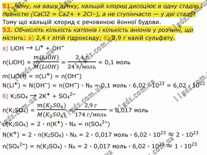 Чому, на вашу думку, кальцій хлорид дисоціює в одну стадію і повністю (CaCl2 = Ca2+ + 2Cl–), а не ступінчасто — у дві стадії? Тому що кальцій хлорид є речовиною йонної будови. 52. Обчисліть кількість катіонів і кількість аніонів у розчині, що містить: а) 2,4 г літій гідроксиду; б) 2,9 г калій сульфату. а) LіОН → Li+ + ОН– n(LiOH) = (m(LiOH))/(M(LiOH)) = (2,4 г)/(24 г/моль) = 0,1 моль m(LiОН) = n(Li+) = n(ОН–) N(Lі+) = N(ОН–) = n(ОН–) ∙ NА = 0,1 моль ∙ 6,02 ∙ 1023 = 6,02 ∙ 1022 б) K2SO4 → 2K+ + SO42– n(K2SO4) = (m(K_2 SO_4))/(M(K_2 SO_4)) = (2,9 г)/(174 г/моль) = 0,017 моль n(K2SO4) = 2 ∙ n(K+) ∙ NA = n(SO42–) N(K+) = 2 ∙ n(K2SO4) ∙ NA = 2 ∙ 0,017 моль ∙ 6,02 ∙ 1023 ≈ 2 ∙ 1023 n(SO42–) = n(K2SO4) ∙ NA = 2 ∙ 0,017 моль ∙ 6,02 ∙ 1023 ≈ 1 ∙ 1023