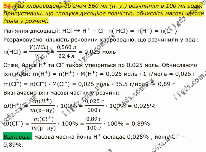 Газ хлороводень об’ємом 560 мл (н. у.) розчинили в 100 мл води. Припустивши, що сполука дисоціює повністю, обчисліть масові частки йонів у розчині. Рівняння дисоціації: НСl → Н+ + Сl– n( НСl) = n(Н+) = n(Сl–) Розраховуємо кількість речовини хлороводню, що розчинили у воді: n(HCl) = (V(HCl))/V_m = (0,560 л)/(22,4 л) = 0,025 моль Отже, йонів Н+ та Сl– також утвориться по 0,025 моль. Обчислюємо їхні маси: m(Н+) = n(H+) ∙ М(Н+) = 0,025 моль ∙ 1 г/моль = 0,025 г m(Сl–) = n(Сl–) ∙ M(Сl–) = 0,025 моль ∙ 35,5 г/моль ≈ 0,89 г Визначаємо їхні масові частки у розчині: ω(H+) = (m(H^+))/(m(р-ну)) ∙ 100% = (0,025 г)/(100 г) ∙ 100% = 0,025% ω(Сl+) = (m(〖Cl〗^+))/(m(р-ну)) ∙ 100% = (0,89 г)/(100 г) ∙ 100% = 0,89% Відповідь: масова частка йонів Н+ складає 0,025% , йонів Сl– – 0,89%.