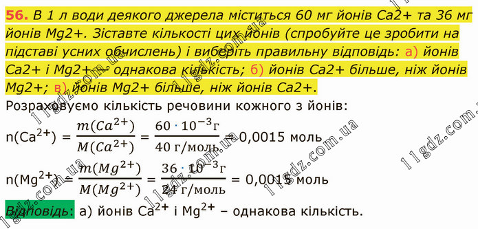 В 1 л води деякого джерела міститься 60 мг йонів Сa2+ та 36 мг йонів Mg2+. Зіставте кількості цих йонів (спробуйте це зробити на підставі усних обчислень) і виберіть правильну відповідь: а) йонів Ca2+ і Mg2+ — однакова кількість; б) йонів Ca2+ більше, ніж йонів Mg2+; в) йонів Mg2+ більше, ніж йонів Ca2+. Розраховуємо кількість речовини кожного з йонів: n(Ca2+) = (m(〖Ca〗^(2+)))/(M(〖Ca〗^(2+))) = (60 ∙ 10^(-3) г)/(40 г/моль) = 0,0015 моль n(Mg2+) = (m(〖Mg〗^(2+)))/(M(〖Mg〗^(2+))) = (36 ∙ 10^(-3) г)/(24 г/моль) = 0,0015 моль Відповідь: а) йонів Са2+ і Мg2+ – однакова кількість.