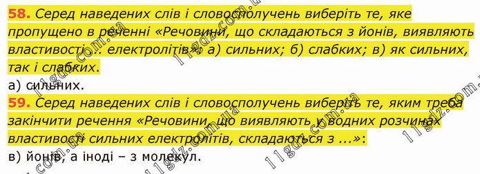 Серед наведених слів і словосполучень виберіть те, яке пропущено в реченні «Речовини, що складаються з йонів, виявляють властивості ... електролітів»: а) сильних; б) слабких; в) як сильних, так і слабких. а) сильних. 59. Серед наведених слів і словосполучень виберіть те, яким треба закінчити речення «Речовини, що виявляють у водних розчинах властивості сильних електролітів, складаються з ...»: в) йонів, а іноді – з молекул.
