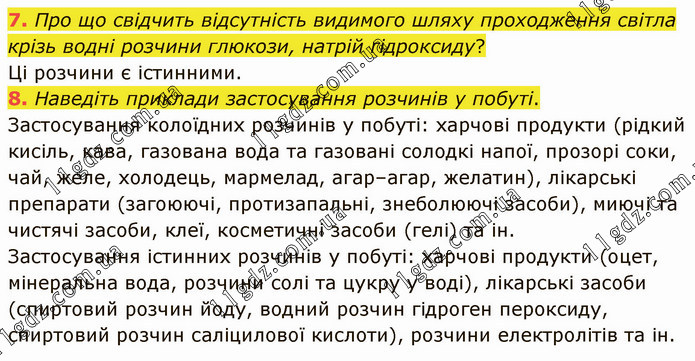 Про що свідчить відсутність видимого шляху проходження світла крізь водні розчини глюкози, натрій гідроксиду? Ці розчини є істинними. 8. Наведіть приклади застосування розчинів у побуті. Застосування колоїдних розчинів у побуті: харчові продукти (рідкий кисіль, кава, газована вода та газовані солодкі напої, прозорі соки, чай, желе, холодець, мармелад, агар–агар, желатин), лікарські препарати (загоюючі, протизапальні, знеболюючі засоби), миючі та чистячі засоби, клеї, косметичні засоби (гелі) та ін. Застосування істинних розчинів у побуті: харчові продукти (оцет, мінеральна вода, розчини солі та цукру у воді), лікарські засоби (спиртовий розчин йоду, водний розчин гідроген пероксиду, спиртовий розчин саліцилової кислоти), розчини електролітів та ін.