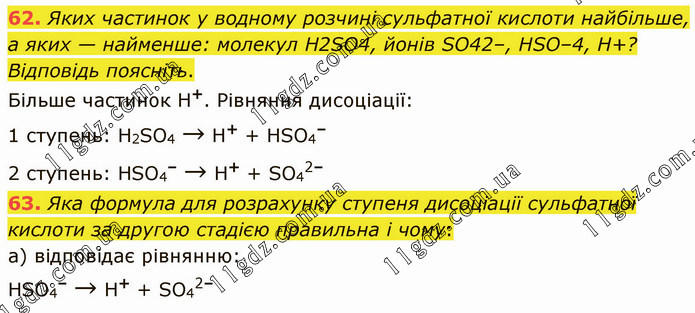 Яких частинок у водному розчині сульфатної кислоти найбільше, а яких — найменше: молекул H2SO4, йонів SO42–, HSO–4, H+? Відповідь поясніть. Більше частинок Н+. Рівняння дисоціації: 1 ступень: Н2SO4 → Н+ + НSO4– 2 ступень: НSO4– → Н+ + SO42– 63. Яка формула для розрахунку ступеня дисоціації сульфатної кислоти за другою стадією правильна і чому: а) відповідає рівнянню: НSO4– → Н+ + SO42–