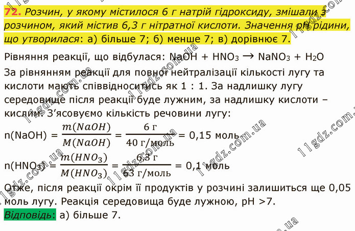Розчин, у якому містилося 6 г натрій гідроксиду, змішали з розчином, який містив 6,3 г нітратної кислоти. Значення рН рідини, що утворилася: а) більше 7; б) менше 7; в) дорівнює 7. Рівняння реакції, що відбулася: NaОН + НNO3 → NaNO3 + Н2O За рівнянням реакції для повної нейтралізації кількості лугу та кислоти мають співвідноситись як 1 : 1. За надлишку лугу середовище після реакції буде лужним, за надлишку кислоти – кислим. З’ясовуємо кількість речовини лугу: n(NaOH) = (m(NaOH))/(M(NaOH)) = (6 г)/(40 г/моль) = 0,15 моль n(HNO3) = (m(HNO_3))/(M(HNO_3)) = (6,3 г)/(63 г/моль) = 0,1 моль Отже, після реакції окрім її продуктів у розчині залишиться ще 0,05 моль лугу. Реакція середовища буде лужною, рН >7. Відповідь: а) більше 7.