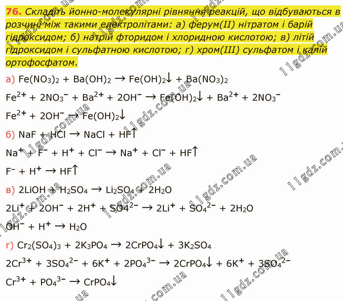 Складіть йонно-молекулярні рівняння реакцій, що відбуваються в розчині між такими електролітами: а) ферум(ІІ) нітратом і барій гідроксидом; б) натрій фторидом і хлоридною кислотою; в) літій гідроксидом і сульфатною кислотою; г) хром(ІІІ) сульфатом і калій ортофосфатом. a) Fe(NO3)2 + Ba(OH)2 → Fe(OH)2↓ + Ba(NO3)2 Fe2+ + 2NO3– + Ba2+ + 2OH– → Fe(OH)2↓ + Ba2+ + 2NO3– Fe2+ + 2OH– → Fe(OH)2↓ б) NaF + HCl → NaCl + HF↑ Na+ + F– + H+ + Cl– → Na+ + Cl– + HF↑ F– + H+ → HF↑ в) 2LiOH + H2SO4 → Li2SO4 + 2H2O 2Li+ + 2OH– + 2H+ + SO42– → 2Li+ + SO42– + 2H2O OH– + H+ → H2O г) Cr2(SO4)3 + 2K3PO4 → 2CrPO4↓ + 3K2SO4 2Cr3+ + 3SO42– + 6K+ + 2PO43– → 2CrPO4↓ + 6K+ + 3SO42– Cr3+ + PO43– → CrPO4↓