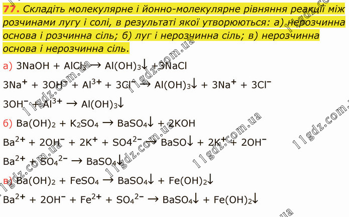 Складіть молекулярне і йонно-молекулярне рівняння реакції між розчинами лугу і солі, в результаті якої утворюються: а) нерозчинна основа і розчинна сіль; б) луг і нерозчинна сіль; в) нерозчинна основа і нерозчинна сіль. a) 3NaOH + AlCl3 → Al(OH)3↓ +3NaCl 3Na+ + 3OH– + Al3+ + 3Cl– → Al(OH)3↓ + 3Na+ + 3Cl– 3OH– + Al3+ → Al(OH)3↓ б) Ba(OH)2 + K2SO4 → BaSO4↓ + 2KOH Ba2+ + 2OH– + 2K+ + SO42– → BaSO↓ + 2K+ + 2OH– Ba2+ + SO42– → BaSO4↓ в) Ba(OH)2 + FeSO4 → BaSO4↓ + Fe(OH)2↓ Ba2+ + 2OH– + Fe2+ + SO42– → BaSO4↓ + Fe(OH)2↓