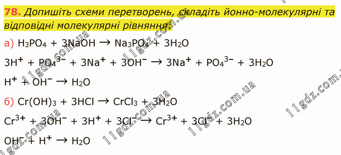 Допишіть схеми перетворень, складіть йонно-молекулярні та відповідні молекулярні рівняння: a) H3PO4 + 3NaOH → Na3PO4 + 3H2O 3H+ + PO43– + 3Na+ + 3OH– → 3Na+ + PO43– + 3H2O H+ + OH– → H2O б) Cr(OH)3 + 3HCl → CrCl3 + 3H2O Cr3+ + 3OH– + 3H+ + 3Cl– → Cr3+ + 3Cl– + 3H2O OH– + H+ → H2O