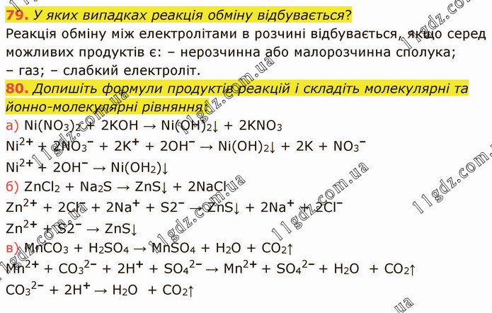 У яких випадках реакція обміну відбувається? Реакція обміну між електролітами в розчині відбувається, якщо серед можливих продуктів є: – нерозчинна або малорозчинна сполука; – газ; – слабкий електроліт. 80. Допишіть формули продуктів реакцій і складіть молекулярні та йонно-молекулярні рівняння: а) Ni(NO3)2 + 2KOH → Ni(OH)2↓ + 2KNO3 Ni2+ + 2NO3– + 2K+ + 2OH– → Ni(OH)2↓ + 2K + NO3– Ni2+ + 2OH– → Ni(OH2)↓ б) ZnCl2 + Na2S → ZnS↓ + 2NaCl Zn2+ + 2Cl– + 2Na+ + S2– → ZnS↓ + 2Na+ + 2Cl– Zn2+ + S2– → ZnS↓ в) MnCO3 + H2SO4 → MnSO4 + H2O + CO2↑ Mn2+ + CO32– + 2H+ + SO42– → Mn2+ + SO42– + H2O + CO2↑ CO32– + 2H+ → H2O + CO2↑