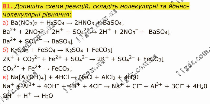 Допишіть схеми реакцій, складіть молекулярні та йонно-молекулярні рівняння: а) Ва(NО3)2 + H2SO4 → 2НNО3 + ВаSO4↓ Ва2+ + 2NO3– + 2Н+ + SO42– → 2Н+ + 2NO3– + ВаSO4↓ Ва2+ + SO42– → ВаSO4↓ б) К2СO3 + FеSO4 → К2SO4 + FеСO3↓ 2К+ + СО32– + Fе2+ + SО42– → 2К+ + SО42– + FеСO3↓ СО32– + Fе2+ → FеСO3↓ в) Na[Аl(ОН)4] + 4НСl → NaCl + АlСl3 + 4Н20 Na+ + Аl3+ + 4OН– + 4Н+ + 4Сl– → Na+ + СІ– + Аl3+ + ЗСl– + 4Н20 OН– + Н+ → Н2O